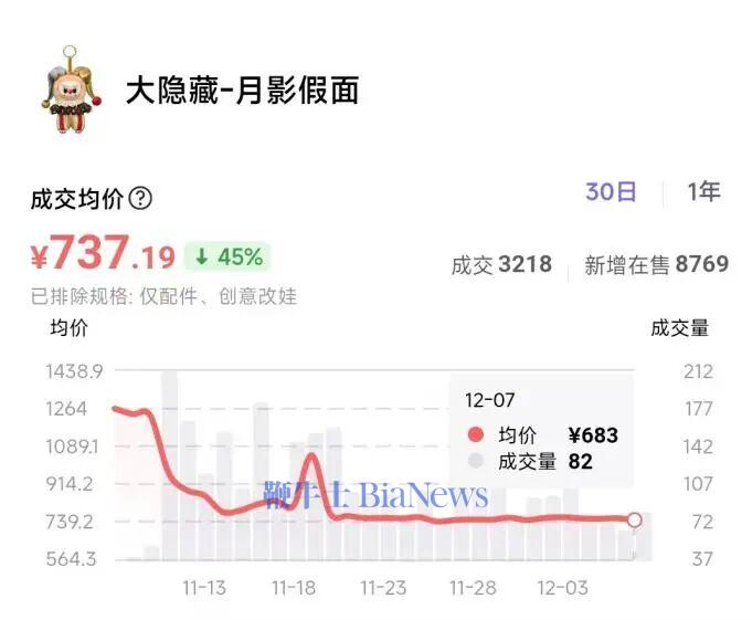 大热新品WHY SO SERIOUS系列搪胶毛绒的大隐藏——Labubu“月影假面”在二手平台曾被炒至最高1200多元,不到一个月时间,价格已回落至683元。
