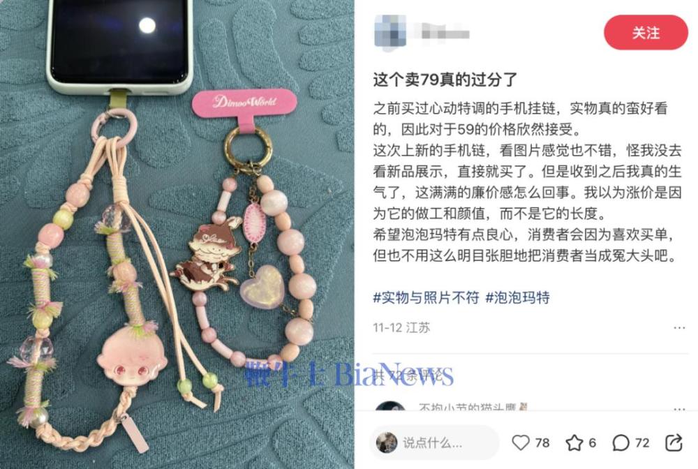 “之前买过Dimmo心动特调的手机挂链,实物真的蛮好看,59元也能接受。新品不仅涨价了,而且满满廉价感。”一位购买了Dimmo手机挂链的消费者吐槽道。另一位消费者也表示,“之前买Dimoo手机链就是因为实用,49-59元的定价也相对划算,怎么现在都跟普通盲盒一个价了?