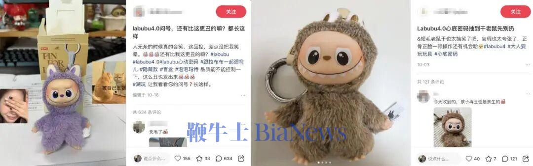 此外,品控问题也构成了这一波消费者集中吐槽和退货的核心因素,品控问题在Labubu4.0系列中尤为显著。“长得像干老鼠”“秃毛”“歪头歪脸”“大小脚”……
