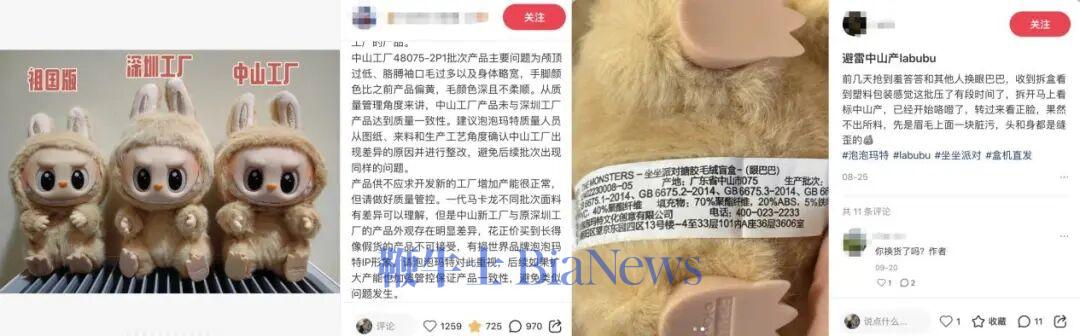 有消费者表示,这批品控饱受诟病的四代Labubu,多数产自广东中山厂,亦有不少人发出了中山工厂的避雷贴。