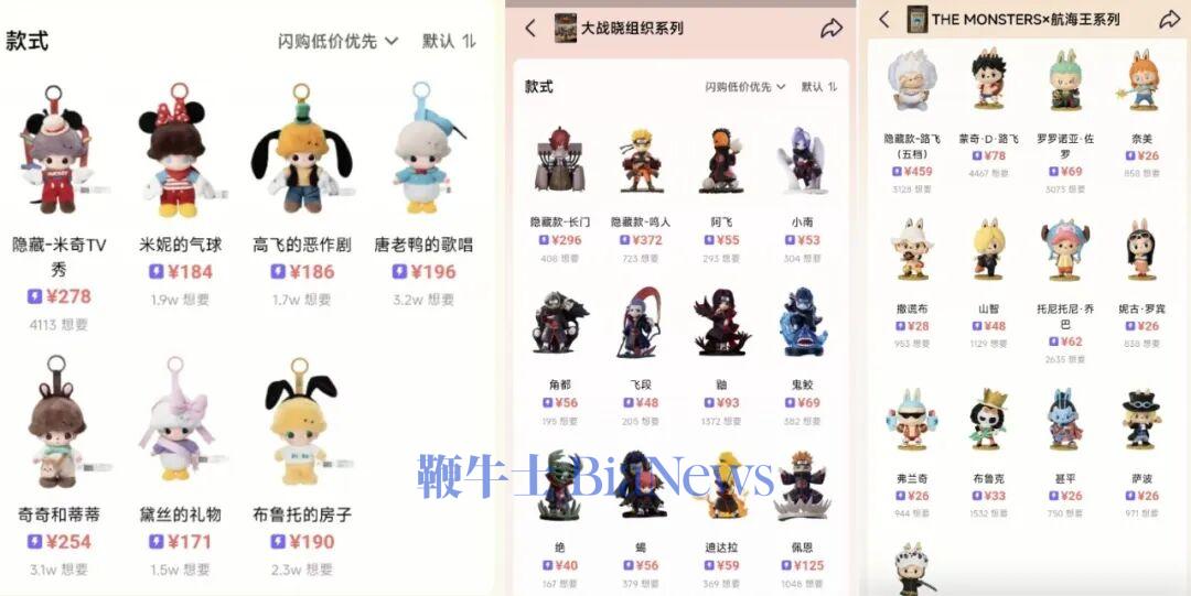 第三,泡泡玛特还在尝试通过联名,再次推动“爆款”的诞生。当下,Labubu与三丽鸥联名的搪胶毛绒系列产品,还未上线已经在社交媒体上引发大量讨论和关注。此前,泡泡玛特Dimoo与迪士尼联名系列从今年3月发售至今,二手市场价格依旧稳定维持在近200元的均价;与火影忍者和海贼王联名系列产品手办,则为泡泡玛特拉入了更多二次元粉丝,实现了有效破圈。