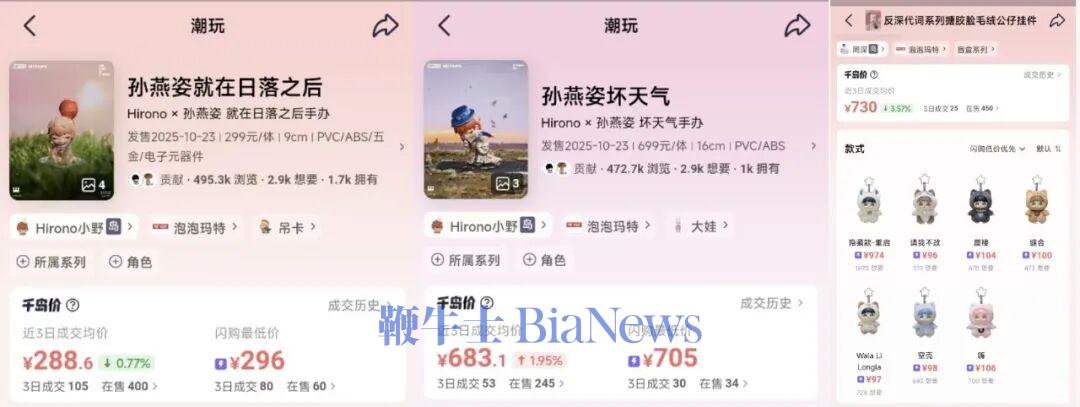 另外,泡泡玛特与歌手周深联名的“反深代词”系列搪胶毛绒再次上演了“一盒难求”的火爆局面,同样IP小野Hirono 与歌手孙燕姿联名的“日落以后”、“坏天气”系列手办,同样在二手市场被炒到高价。