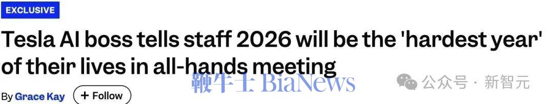 在面向全体员工的内部会议上,特斯拉AI软件副总裁Ashok Elluswamy向Autopilot和Optimus团队发出预警:2026年,将是他们「职业生涯中最艰难的一年」。
