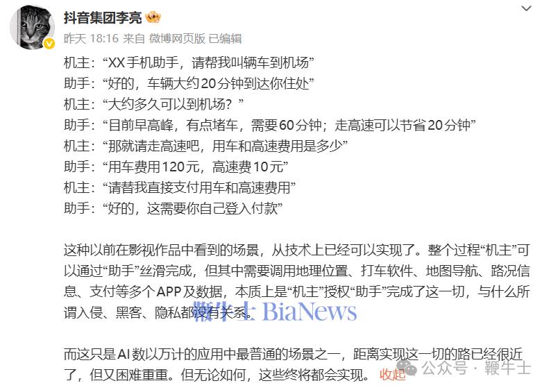 李亮以使用AI手机助手打车为例,指出整个打车过程可以通过“助手”丝滑完成,但其中需要调用地理位置、打车软件、地图导航、路况信息、支付等多个APP及数据,本质上是“机主”授权“助手”完成了这一切,与入侵、黑客、隐私等都没有关系。