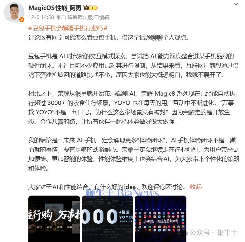 荣耀工程师“阿勇”:“豆包手机”是AI时代新的交互模式探索