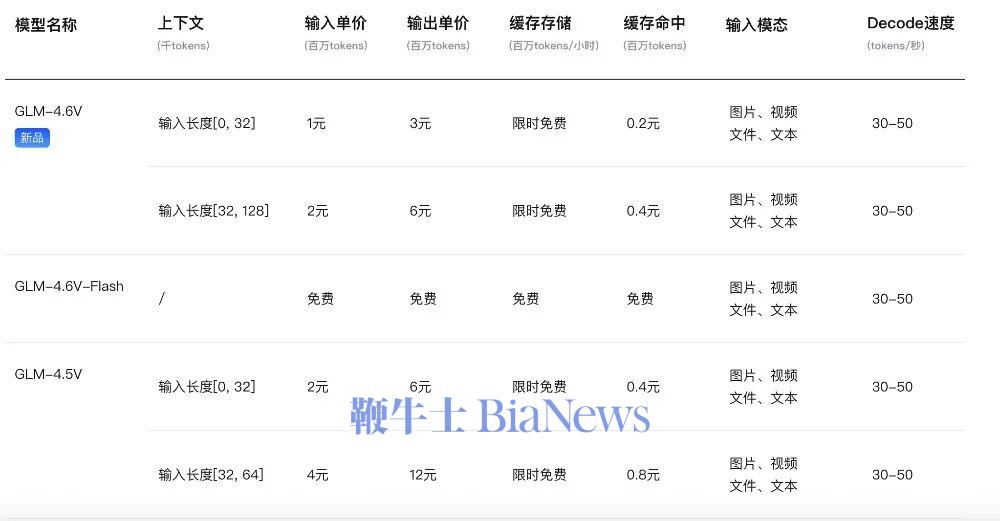 ▲GLM-4.6V系列模型价格表(图源:智谱AI)
