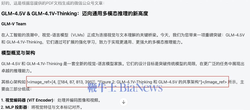 首先是智能图文混排与内容创作能力,GLM-4.6V构建了原生多模态工具调用能力,可以直接理解图像、截图、文档页面等多模态数据,无需先转为文字描述再解析。我们上传了GLM-4.5V的技术报告,要求其生成一篇图文并茂的微信公众号文章。大约1-2分钟,GLM-4.6V就完成了对整个文档的阅读和理解,输出了包含标题、导语、五个章节以及结语的完整公众号文章,但经过多次尝试,其依旧无法显示出图片。