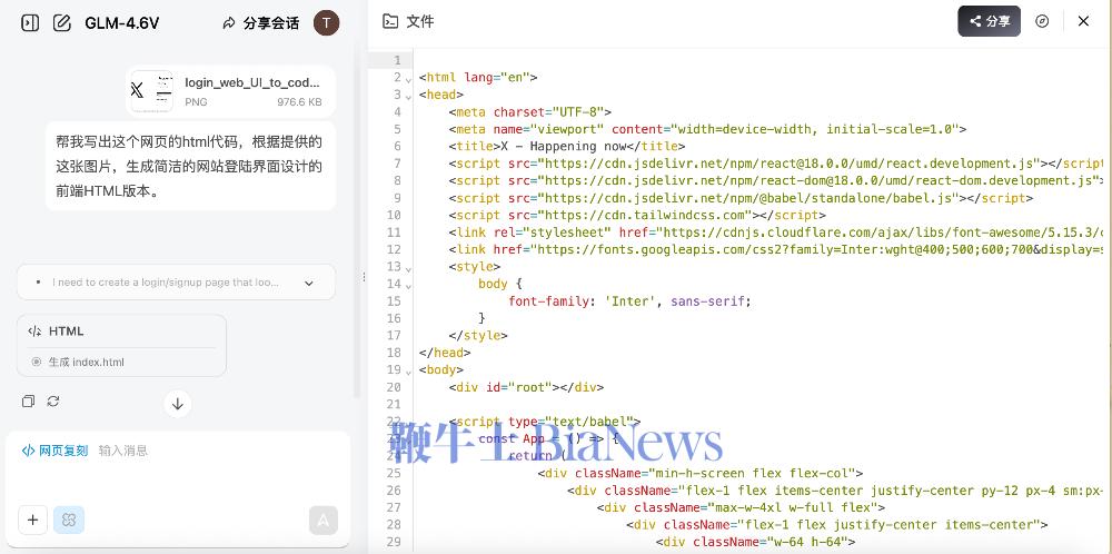 收到指令后,GLM-4.6V就立刻开始逐行生成HTML代码,并显示出预览页面。可以看出,其生成的“仿X”登录网页与原网页几乎一模一样。
