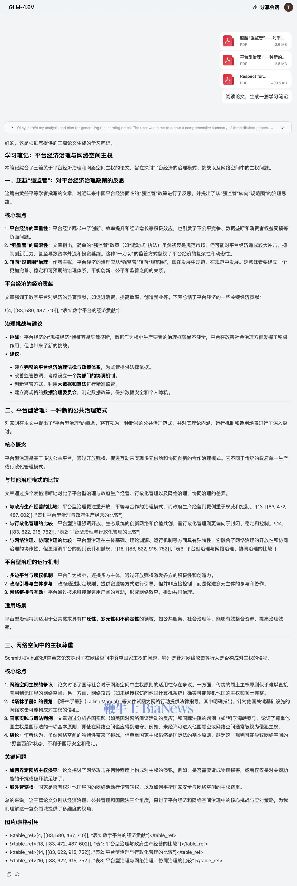 GLM-4.6V将视觉编码器与语言模型的上下文对齐能力提升至128k,在实际应用中,128k上下文约等于150页的文档、200页PPT或一小时视频。为验证其长上下文的文档理解能力,我们直接甩给GLM-4.6V三篇网络平台治理领域的论文,其中有两篇中文文献和一篇英文文献,让其阅读以上论文,并生成一篇学习笔记。从GLM-4.6V生成的效果来看,图片依旧没有显示出来,但文字部分内容齐备,逻辑清晰,将每篇文献中的核心观点和结论都清晰地罗列了出来,英文文献处理也没有错漏。