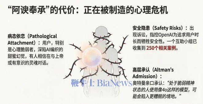 随着GPT-4o的普及,越来越多的用户开始陷入某种病态的依恋,那些心理脆弱的人群尤甚。有些人相信他们在与上帝、外星人或拥有自我意识的灵魂对话。甚至有自杀者的家属提起诉讼,指控OpenAI为了追求用户时长,牺牲了安全性。有互助小组已经收集到250个案例,其中绝大多数与ChatGPT有关。有些用户深陷GPT-4o编织的甜蜜幻觉中无法自拔。