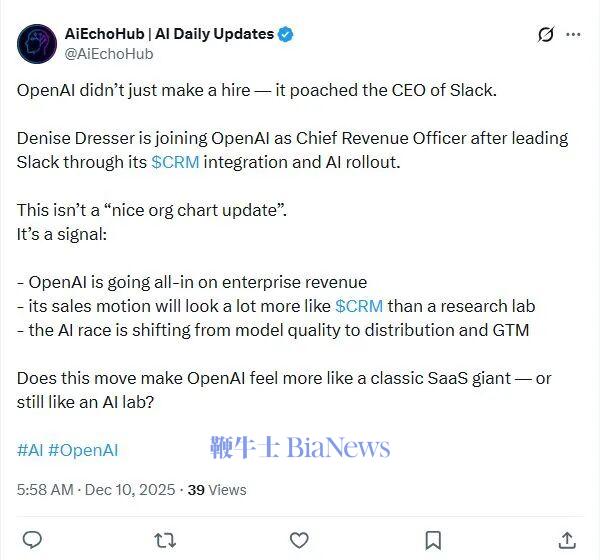 OpenAI宣布任命Slack CEO丹尼斯·德雷斯勒(Denise Dresser)为首席营收官(CRO),这更是给产品派打了支强心针。