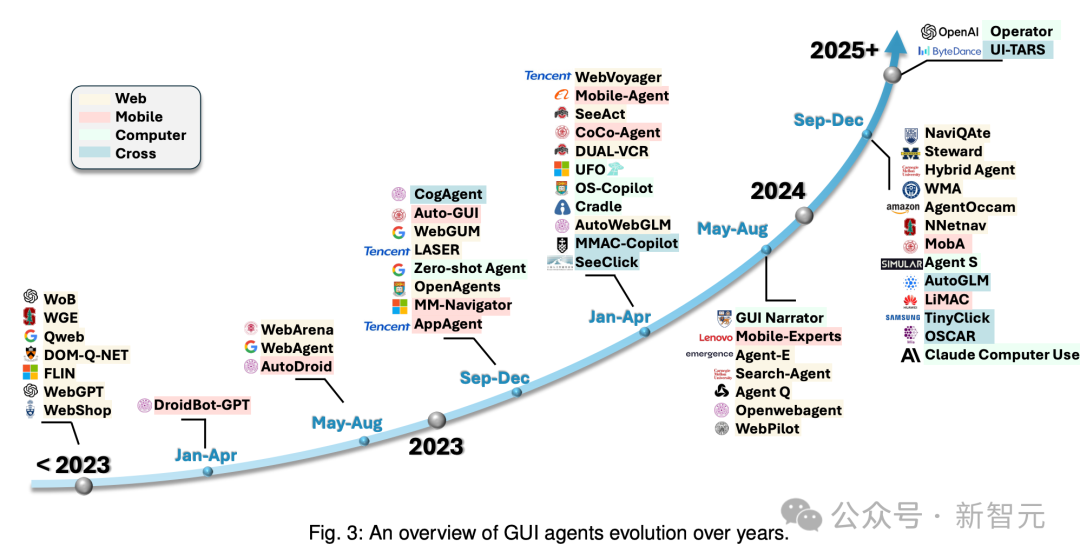 2023年之前,以OpenAI WebGPT为代表。从2023年之后,类似的GUI Agent全面爆发。