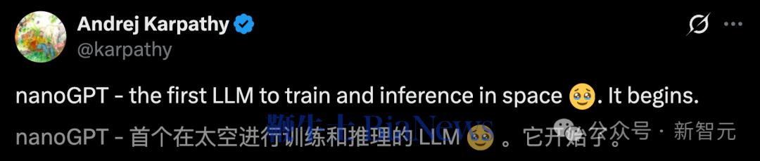 Karpathy本人激动表示,nanoGPT首个在太空进行训练和推理的模型,新征程,就此启航。
