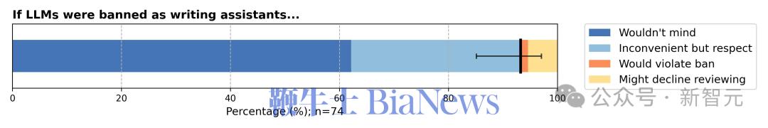从上图的调查结果得知,如果ICML强行搞「一刀切」禁止LLM,虽然大部分人会遵守(深蓝),但会给一部分人带来工作负担(浅蓝),甚至逼迫极少数人走向「学术不端」(橙色)。