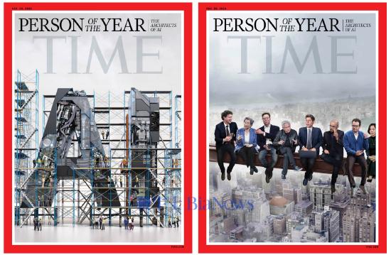 该杂志为其“年度人物”特刊发布了两张封面图片。右图由数字艺术家杰森·塞勒创作,它对1932年的照片《摩天楼顶上的午餐》进行了重新演绎,将照片中的铁匠换成了来自顶尖科技和AI公司的高管,包括马克·扎克伯格(Meta)、苏姿丰(AMD)、埃隆·马斯克(xAI)、黄仁勋(英伟达)、萨姆·奥特曼(OpenAI)、德米斯·哈萨比斯(DeepMind)、达里奥·阿莫迪(Anthropic)以及李飞飞(以人为本人工智能研究院)。