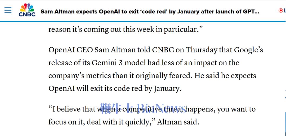 OpenAI 奥特曼:谷歌 Gemini 3未达预期威胁,明年1月解除 “红色警报”