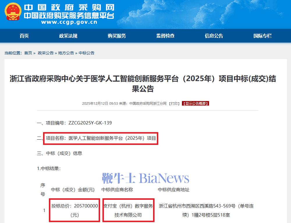 智东西12月12日报道,今天浙江省政府采购中心发布医学人工智能创新服务平台(2025年)项目中标结果公告,支付宝(杭州)数字服务技术有限公司中标,中标金额约为2.06亿元。