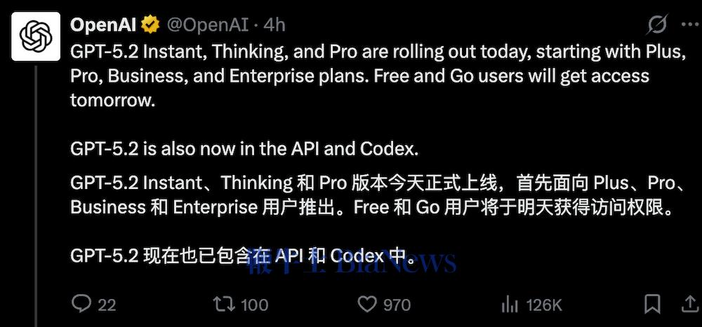 现有的GPT-5.1将在ChatGPT中继续作为过渡版本向付费用户提供三个月,之后将正式下线。OpenAI官方称,GPT-5.2属于其持续改进模型系列的一部分,后续仍将围绕过度拒绝、响应延迟等已知问题进行迭代优化。在API端,GPT-5.2 Thinking对应gpt-5.2,Instant对应gpt-5.2-chat-latest,Pro对应gpt-5.2-pro,开发者可直接调用。