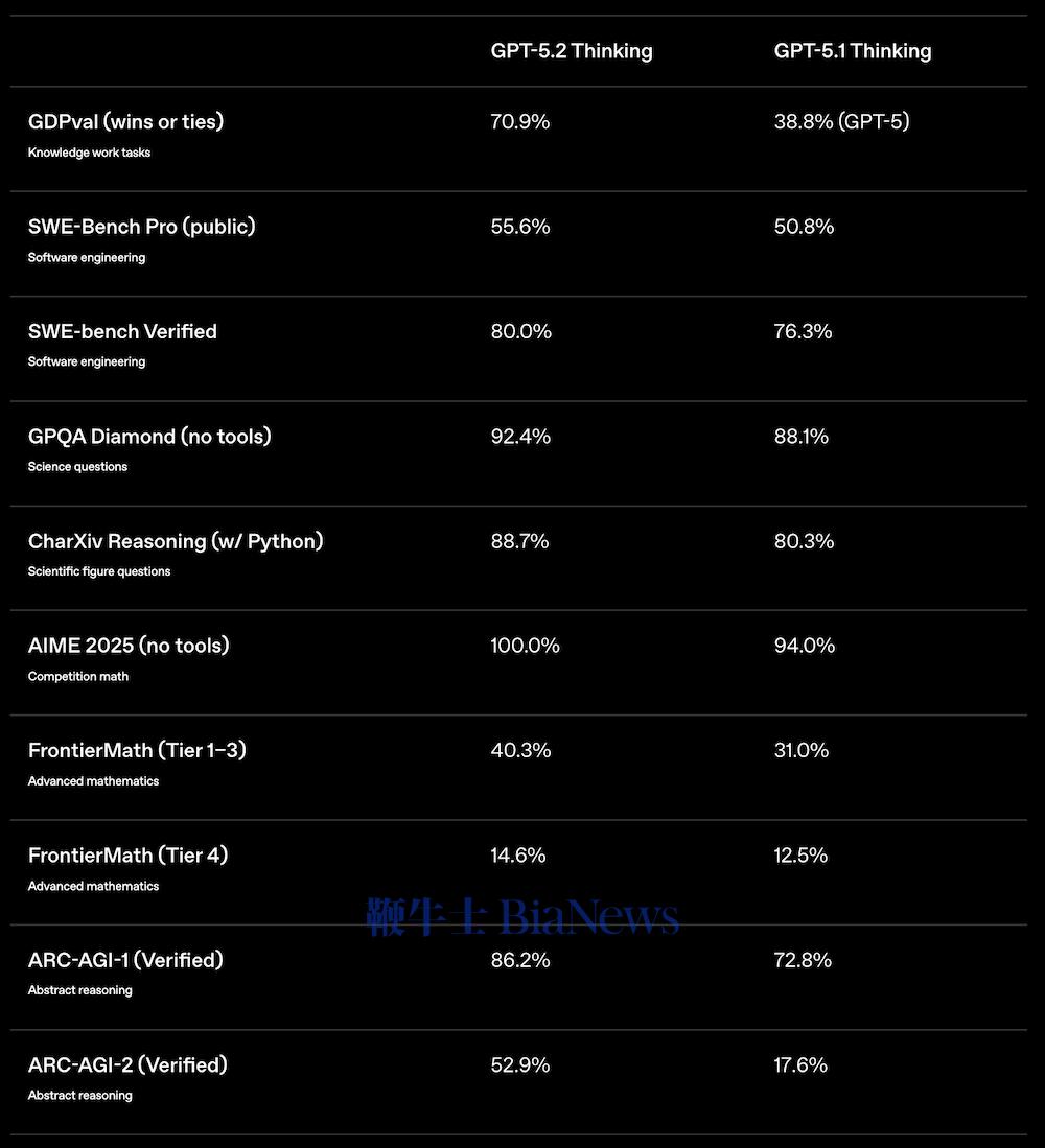 此外,在SWE-Bench Pro、GPQA Diamond等8项基准测试中,GPT-5.2 Thinking的分数均超过谷歌Gemini 3 Pro和Anthropic Claude Opus 4.5。