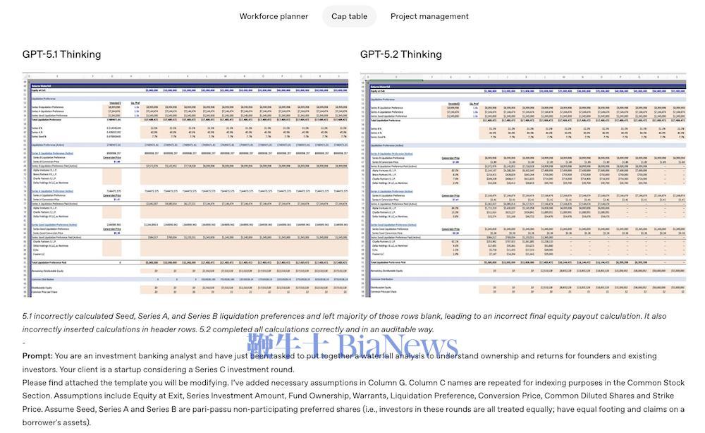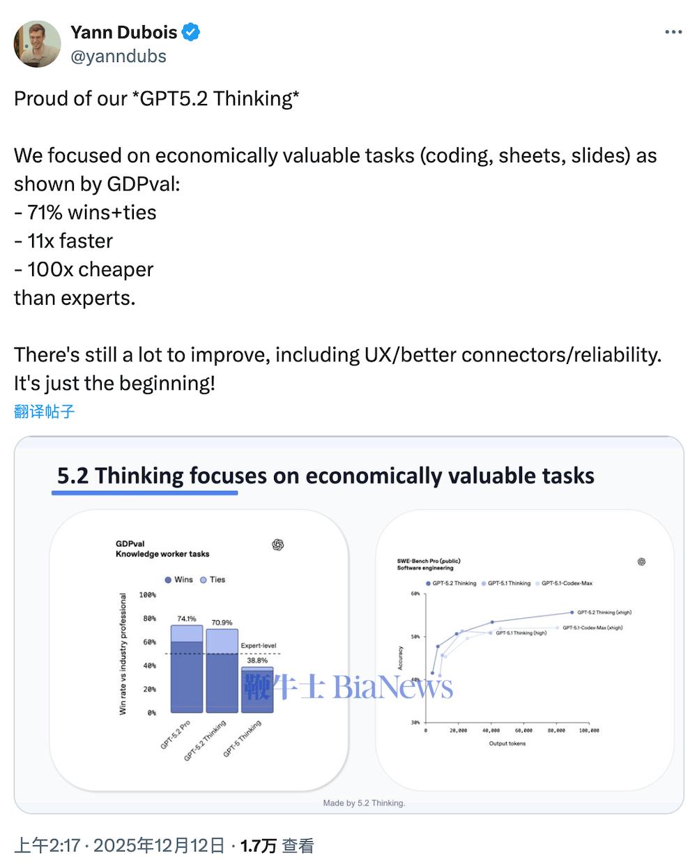 OpenAI团队成员Yann Dubois也在社交平台X平台上发帖称,GPT-5.2 Thinking的设计重点放在“经济价值较高的任务”(如编码、表格与演示文档)。