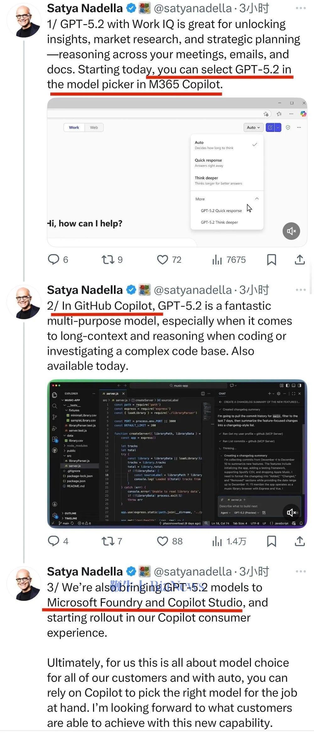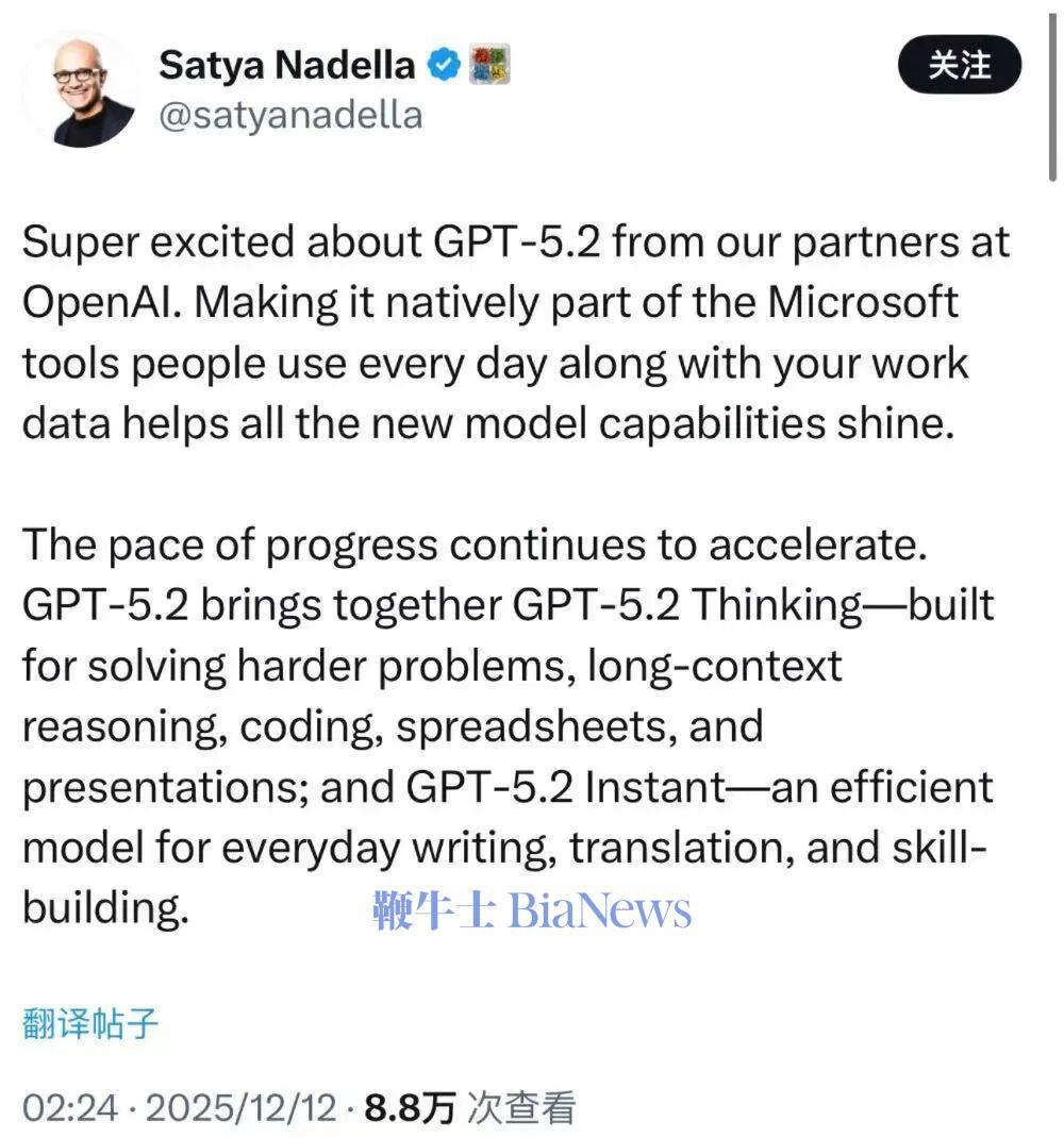 随着GPT-5.2发布,微软董事长兼CEO Satya Nadella也在社交平台X平台上宣布,GPT-5.2将全面进入Microsoft 365 Copilot、GitHub Copilot与Foundry等产品体系,并作为新的“默认推理模型”服务更多工作流场景。