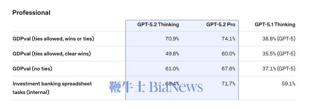 根据OpenAI官方披露,GPT-5.2 Thinking在覆盖44类职业任务的GDPval评测中,首次达到“专家级”表现——在70.9%的对比中战胜或持平行业专业人士。GPT-5.2 Pro进一步提升至74.1%。在仅统计“明确胜出”的任务中,GPT-5.2 Thinking为49.8%,Pro则达到60%。这一评测覆盖销售演示、预算模型、运营排班、制造流程图等多类真实业务成果。GPT-5.2在这些任务的生成速度约为人工专家的11倍,成本为其1%以下。在投研类任务中,GPT-5.2 Thinking在内部评测的投行三表模型与杠杆收购模型等场景中的平均得分为68.4%,较GPT-5.1 Thinking的59.1%有明确提升,GPT-5.2 Pro得分进一步增长至71.7%。