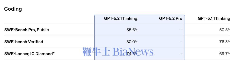 在代码能力方面,GPT-5.2 Thinking在更严格的SWE-bench Pro(跨四种语言、强调真实工程难度)中取得55.6%,在SWE-bench Verified中更是达到80%,均显著领先GPT-5.1的50.8%与76.3%。在SWE-Lancer IC Diamond任务中,GPT-5.2 Thinking取得74.6%(GPT-5.1为69.7%)。
