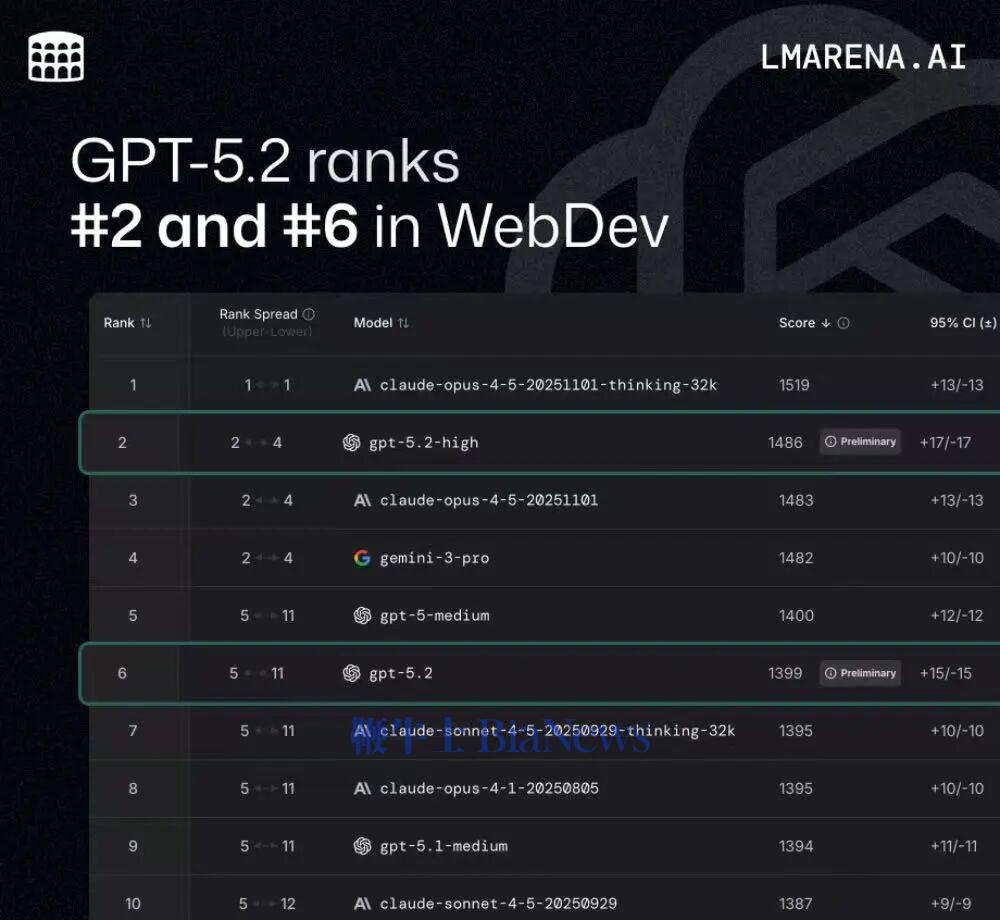 根据Arena说明,GPT-5.2此前在内部以“robin”和“robin-high”为代号进行测试,其分数与GPT-5-medium仅相差1分,目前仍为初步结果,未来有望随着测试量积累而进一步稳定。