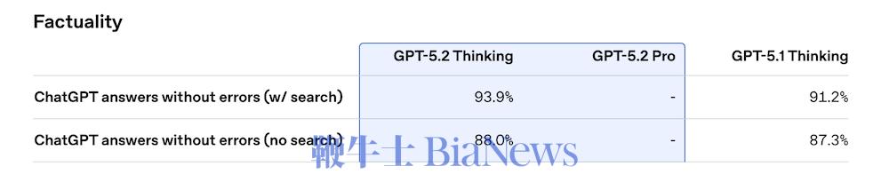 从评测维度来看,Arena主要衡量模型在可部署Web应用情境下的端到端编码能力,GPT-5.2已反映出其在复杂任务链条上的实用性。在事实准确性方面,GPT-5.2 Thinking在基于ChatGPT查询的无错误回答率(开启搜索模式下)达到93.9%,较GPT-5.1的91.2%有所改善,在无搜索情况下也从87.3%提升至88%。