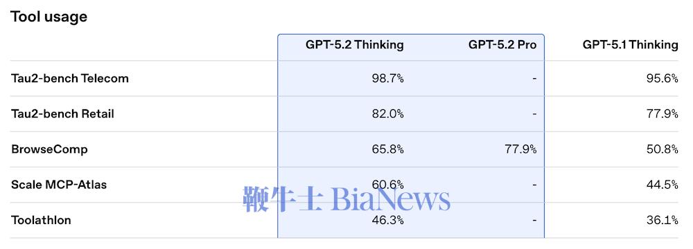 另一个关键变化来自工具调用与长链路任务的可靠性提升。GPT-5.2 Thinking在Tau-2 Bench Telecom中达到98.7%的最高得分,在零推理模式下也大幅领先上一代,在更高噪声的Retail场景中准确率从77.9%提升至82%。在更通用的工具链评估BrowseComp中,GPT-5.2 Thinking达到65.8%,Pro版本达到77.9%,亦高于GPT-5.1的50.8%。