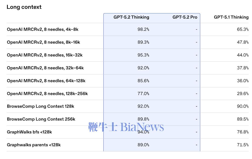 在长上下文能力上,GPT-5.2 Thinking在OpenAI MRCRv2中全面领先上一代,在8 needles测试中从4k到256k的范围内均保持远高于GPT-5.1的表现,其中在4k–8k长度下达98.2%,在128k–256k长度下仍保持77.0%,而GPT-5.1同期为29.6%–47.8%区间。在其他长文场景中,BrowseComp Long Context(128k/256k)中,GPT-5.2 Thinking分别达到92.0%与89.8%。GraphWalks任务中,GPT-5.2 Thinking在bfs与parents子集分别达到94.0%与89.0%,相比GPT-5.1的76.8%与71.5%显著提升。