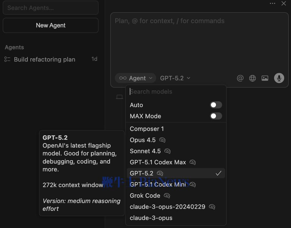 从微软生态的覆盖面来看,GPT-5.2已被定位为“默认生产力模型”,在不同产品线之间以自动模型选择的方式服务更广泛的开发、写作与分析任务。此外,顶流AI编程助手Cursor也已第一时间火速上线GPT-5.2,并同步沿用OpenAI官方API价格。