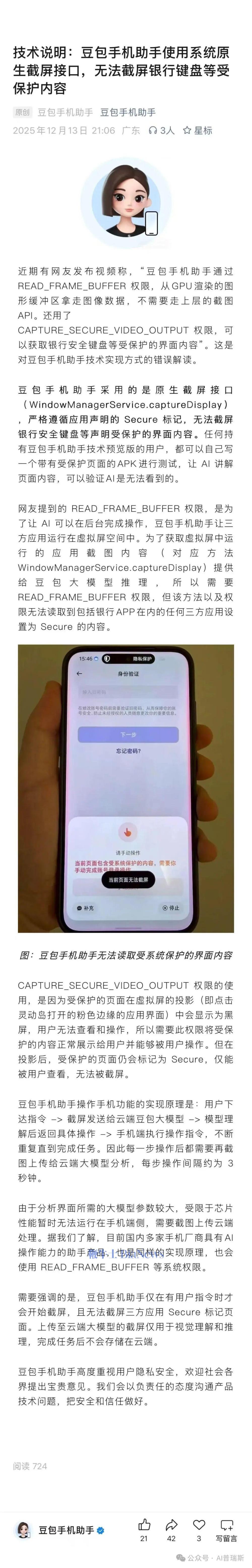 就在刚刚,针对网络上关于“豆包手机助手可绕过系统安全机制、截取银行安全键盘等敏感内容”的讨论,豆包手机助手官方发布技术说明予以回应,明确表示相关说法系对技术实现方式的误读。