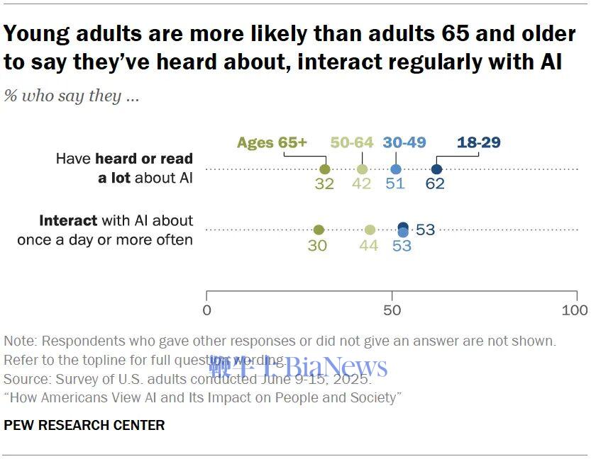 不同年龄段每天使用AI的比例对比。18–29岁的年轻人是最频繁、最熟悉AI的群体:53%每天使用一次以上,远高于65+的30%。