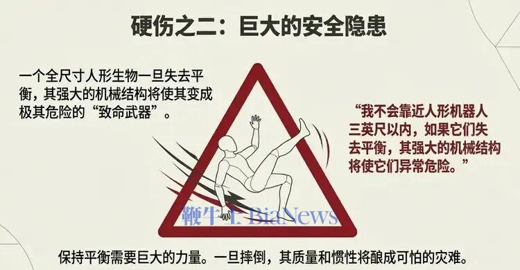 2. 巨大的安全隐患: 布鲁克斯警告称:“我不会靠近人形机器人三英尺(约0.9米)以内,如果它们失去平衡,其强大的机械结构将使它们异常危险。” 保持平衡需要巨大的力量,而一旦这个全尺寸的人形生物摔倒,其质量和惯性将酿成一场可怕的灾难。