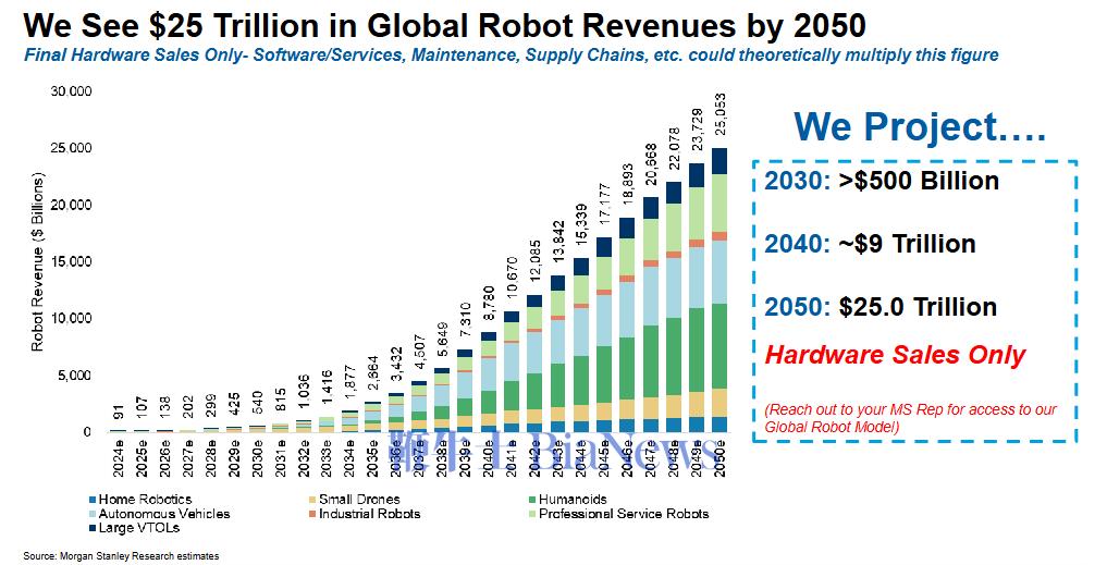 人工智能正在发生一场根本性转向——从数字世界走向物理世界,据大摩全球最新机器人模型显示,这一转变将催生一个规模高达25万亿美元的全球机器人硬件市场。随着AI技术从处理"比特与字节"的知识经济扩展至操控"原子与光子"的物理经济,一场机器人领域的"寒武纪大爆发"正在到来。
