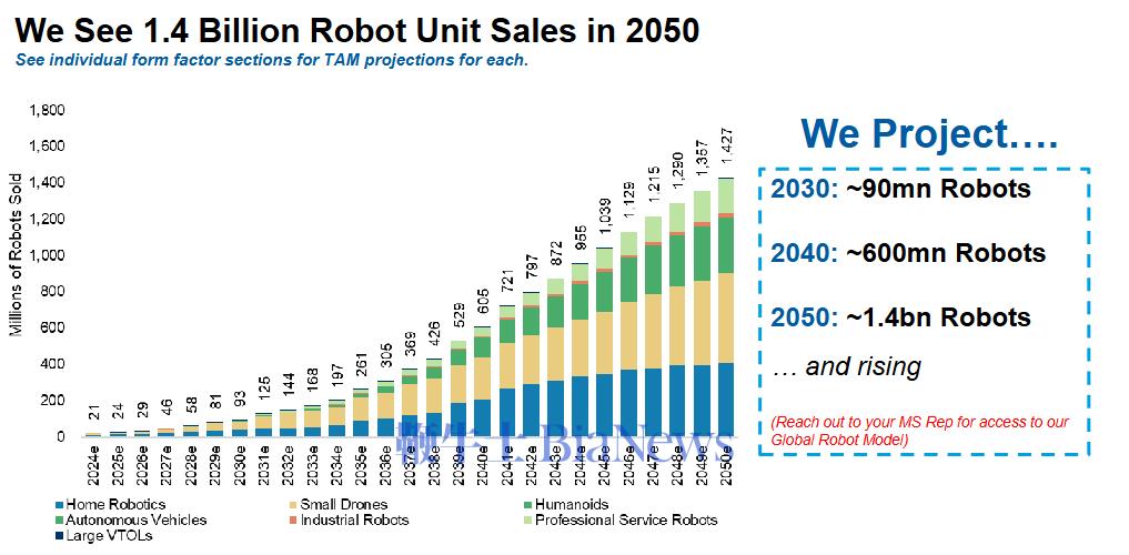 大摩通过其全球机器人模型(GROM)预测,到2050年全球将销售14亿台机器人,运行中的机器人总数将达到65亿台。