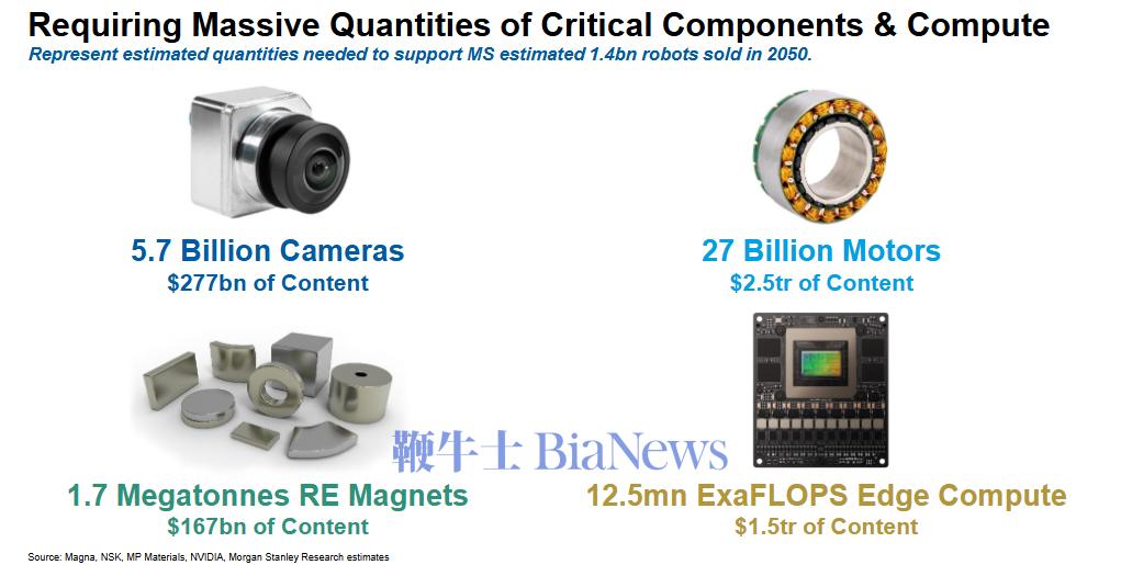 这一需求激增将为电机、轴承、稀土、摄像头、传感器、AI芯片、电池等供应商带来重大商机。