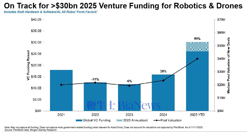 在这方面,中国展现出明显优势。据大摩统计,2025年机器人和无人机领域的风险投资有望超过300亿美元,AI相关企业融资总额将达到2600亿美元,中国企业在其中占据重要地位。在人形机器人开发商名单中,中国公司数量众多,包括优必选、小鹏机器人、乐聚机器人等。