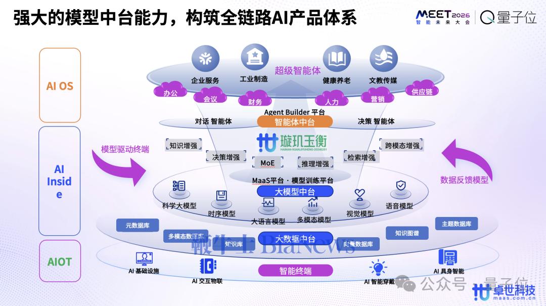 它代表了模型从预训练到微调,再到智能体的开发,再到整个数据工程和整个产品落地的工程化能力,通过璇玑玉衡大模型技术会串联起来从下面的智能终端再到中间的大模型中台,或者可以称之为企业的AI大脑——向上去构建众多的超级智能体,面向不同的领域和行业做场景的赋能。