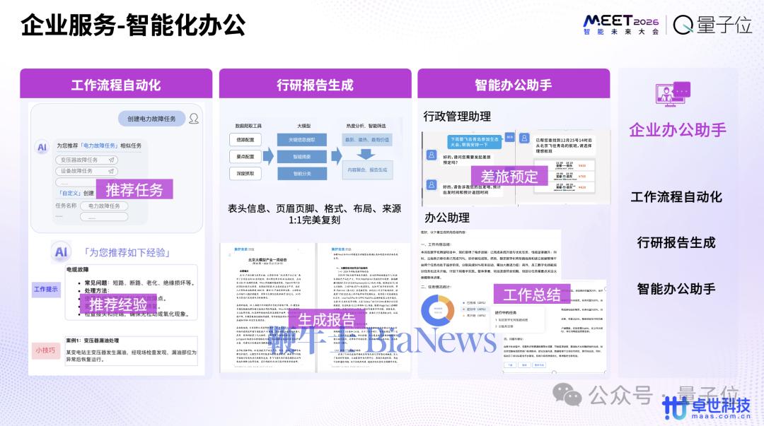 我们把大模型的能力融入进整个工作的流程当中,辅助它做行研报告的生成,以及相关的各种流程、预定和总结的智能办公助手,这是面向国央企做的企业服务。