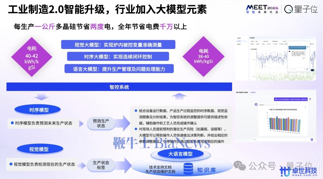 所以我们的经验是在工业制造里落地,它是一个组合拳,大模型在其中起到的是大脑的作用,要融合进我们用到的视觉模型,去处理各类生产和传感数据的时序模型,把这些模型能力融合完之后,能够自动化地调配生产参数,去调优生产工艺,最终实现节能降耗,或者是降低生产瑕疵产品的使用率。