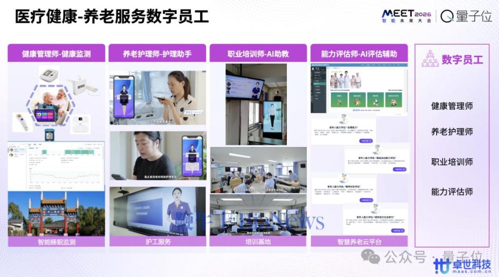 而面向养老方面,服务养老机构各类数字员工,如图上说的我们有健康管理师、养老护理师、职业培训师、能力评估师,这些都是在养老领域上岗之前需要持执照的,考核通过后才能上岗,我们大模型通过这几个岗位专门做了相关的训练和开发,已经可以持证上岗。