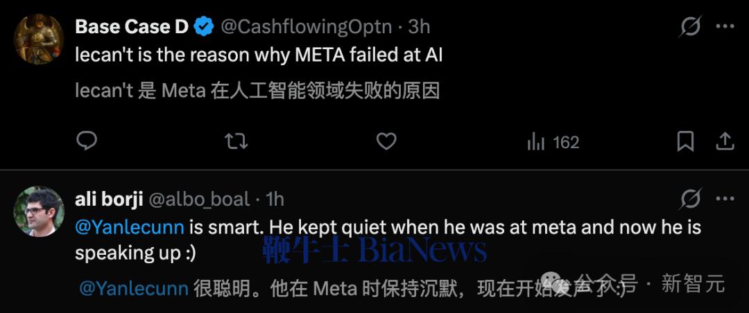 还有人表示,「LeCun很聪明,在Meta保持沉默现在开始发声了」。