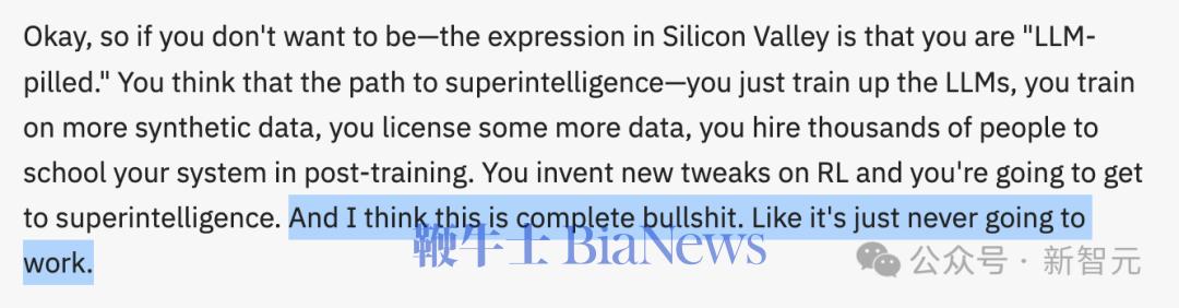 所谓的ASI路线——不断训练LLM,用更多合成数据喂模型,雇上几千人在后训练阶段「管教」系统,再折腾出一些RL的新技巧。 在我看来,完全是胡说八道! 这条路根本行不通,而且永远都不可能成功。
