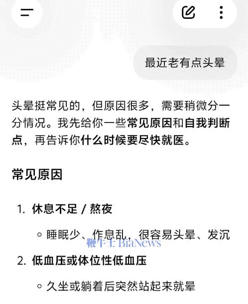 最近我总是头晕,虽然这不是啥大毛病,但AI们都相当关心我,给我指明了一些可能的症状和产生问题的原因,还给出了些就医指南。