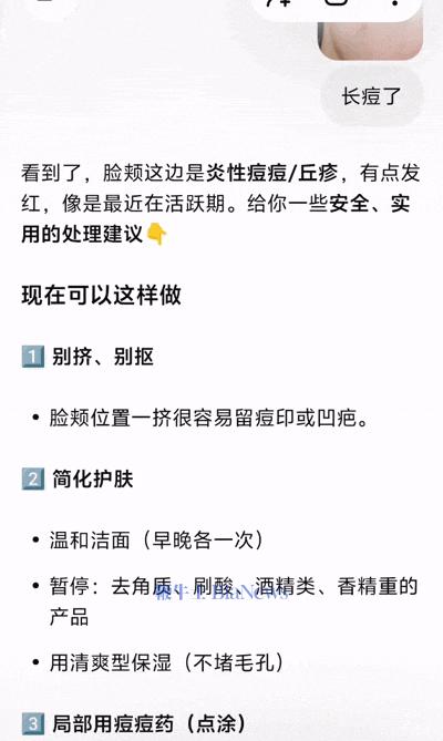 正好今天爆痘了,但是咱以前就经常分不清是上火了还是感染,上网一顿乱搜也不知道涂点啥。这次通用AI倒是没说废话,我把照片传上去,它立马给我列了一大堆分析:
