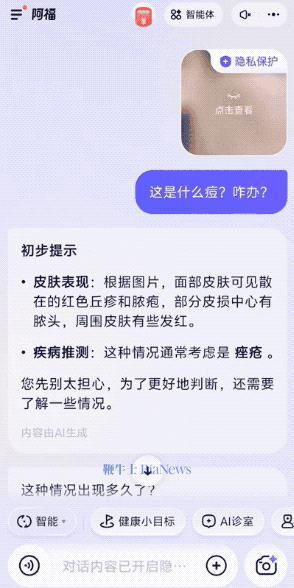 同样的这脸痘,拍照给阿福上传以后,人家不仅识别出了痘痘的类型,还自动开启了分析追问模式。
