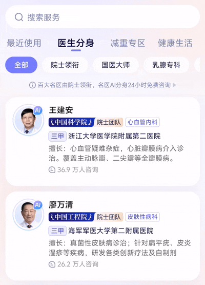 在阿福里,有超过500名三甲医院的真医生,开设了“AI分身”,里边甚至包含了好几个院士级别的专家。