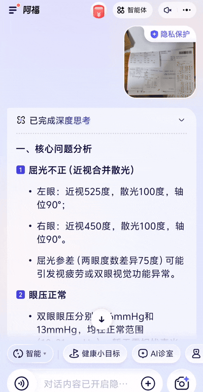 再看看阿福是怎么读的,同样的照片传上去,阿福直接给出了分析后的准确数据,甚至还敏锐地指出了通用AI完全忽略的问题(比如屈光参差),并提示我这可能会导致视疲劳。